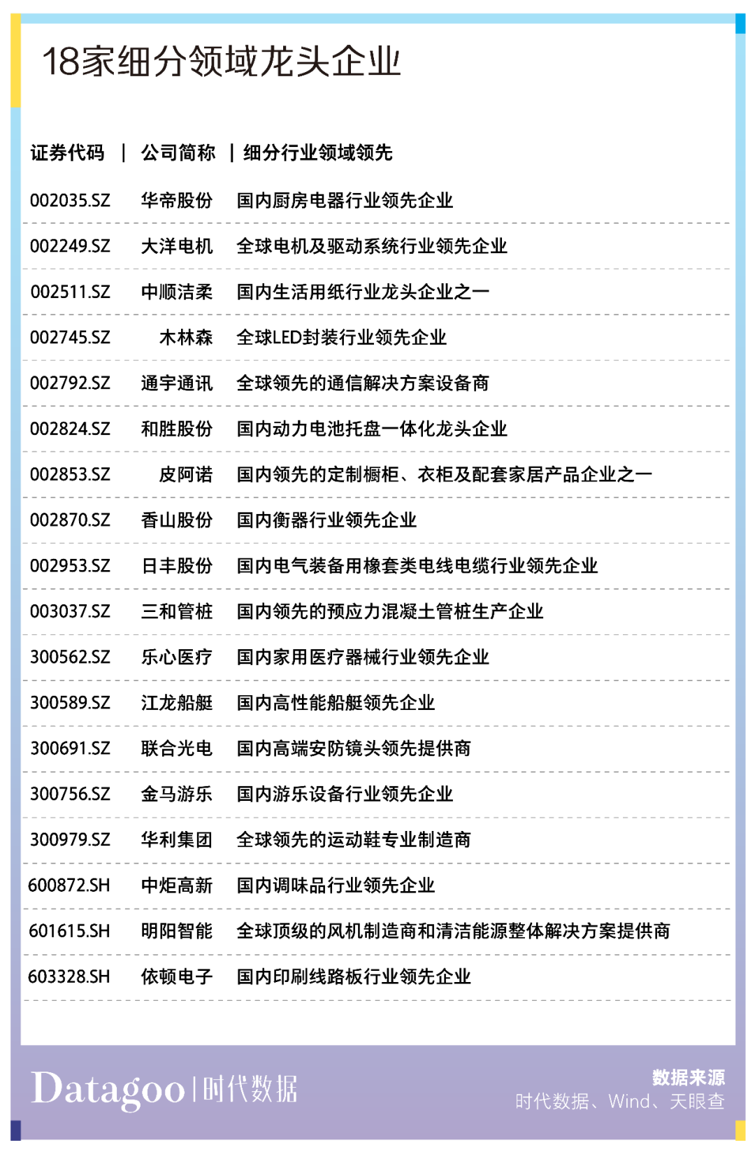 **據時代數據梳理,在23家公司中,有18家公司屬於各自領域的領先企業,佔比高達78.26%。**其中,大洋電機(002249)、木林森(002745)、通宇通訊(002792)、華利集團(300979)、明陽智能(601615)等企業的主要產品、核心技術或生產銷售規模已經處於全球領先地位。