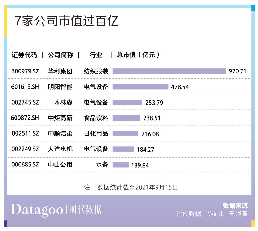 在資本市場的推動下,上市公司發展迅猛,市值水漲船高。**據時代數據統計,截至2021年9月15日,共有7家公司市值突破100億元。**華利集團(300979)的市值雄踞第一,達到970.71億元;其次是明陽智能(601615),市值478.54億元。其後,木林森(002745)、中炬高新(600872)和中順潔柔(002511)市值均達到200億元。