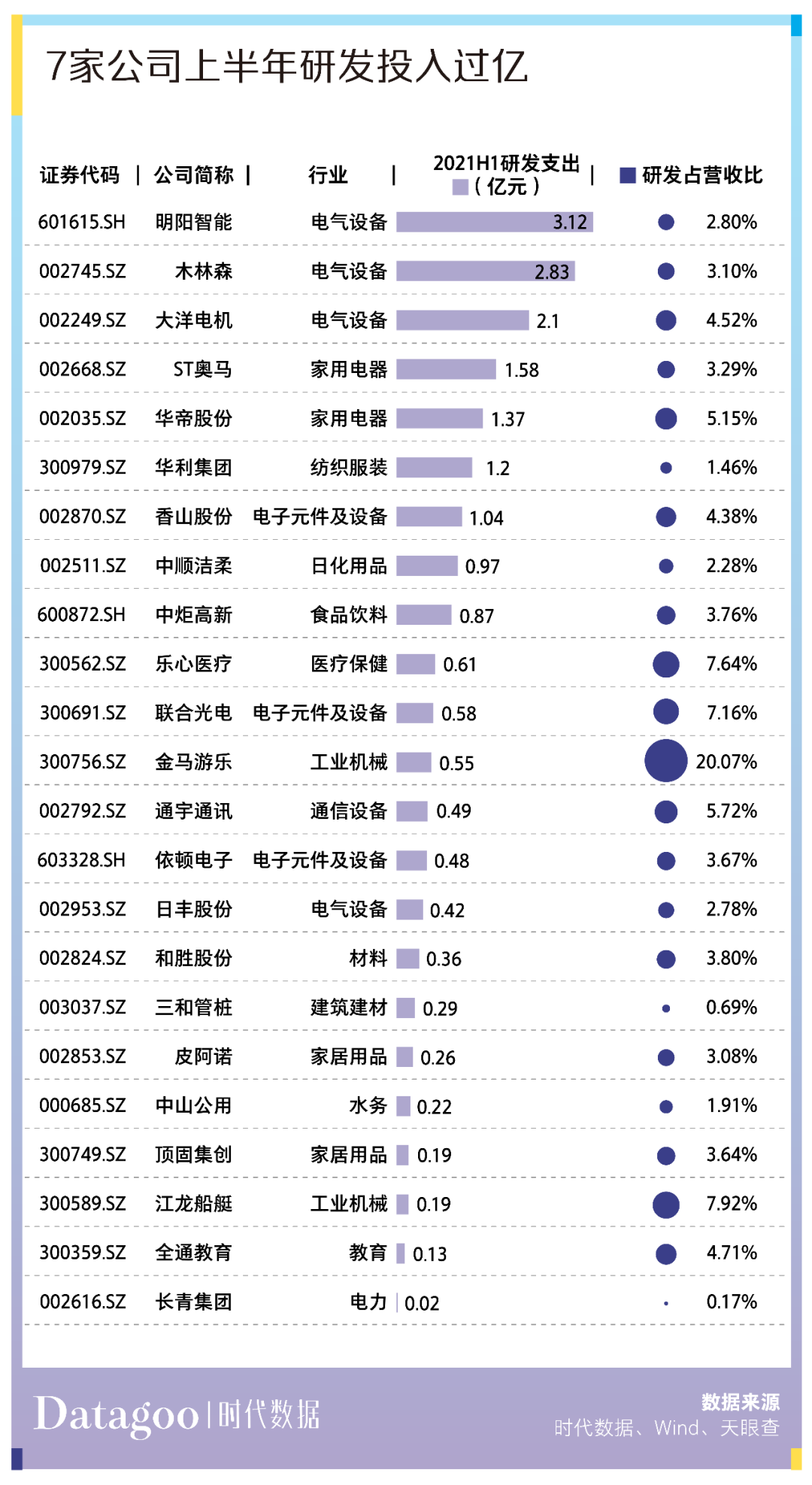其中,明陽智能(601615)研發投入位居第一,為3.12億元,占上半年營收的2.8%;木林森(002745)研發投入位居第二,為2.83億元,占上半年營收的3.1%;大洋電機(002249)研發投入位居第三,為2.1億元,占上半年營收的4.52%。