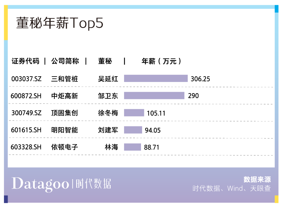據時代數據統計,在這23家公司中,有3家公司的董秘2020年年薪超過100萬元。其中,最高的是三和管樁(003037)董秘吳延紅,年薪306.25萬元;中炬高新(600872)董秘鄒衞東以290萬元年薪位居第二;頂固集創(300749)董秘徐冬梅以105.11萬元年薪位居第三。