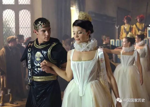 顯然這是又一樁當時歐洲王室常見的政治婚姻。但在日後的相處中,熱情年少的亨利八世非常喜歡大他六歲的凱瑟琳。7年之後父親去世,他就與凱瑟琳完婚並一起加冕。當然,指望生性風流的亨利八世從一而終是不現實的,雖然他一直不缺情婦,但他和王后早年的婚姻生活還是相當美滿的,這在劇中也表現得很明顯。故事一開始,亨利八世和凱瑟琳王后已經育有一女,彼此感情很融洽,王后雖韶華漸逝,但氣質高貴大方,在各種政治外交場合都能表現出母儀天下的強大氣場。