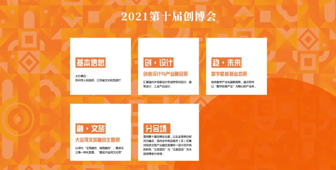 在蘇州文化產業發展佈局指導下,蘇州市文化廣電和旅遊局承辦的第十屆蘇州創博會(2021年9月23日-25日)又出新招,圍繞“設計引領·數字賦能”的主題佈置了“創業設計與產業融合”“數字賦能新業態發展”“大運河文旅融合展”三個展陳,同時在以主會場為核心的基礎上,設計了覆蓋蘇州全市的多個分會場。