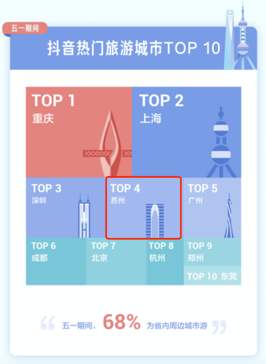 **要論蘇州模式的獨特之處,很大程度在於其對當地文化資源的傳承和創新。**一方面,基於其園林建築等物質基礎提升旅遊影響力,在抖音熱門旅遊城市榜單中連續兩年位居前十,最新數據2021年五一期間排名已升到第四;