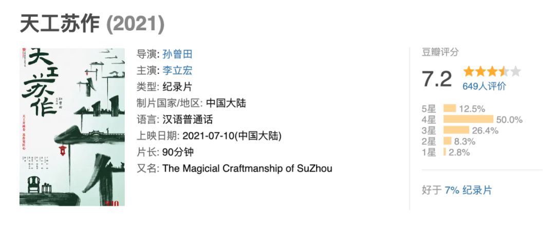 另一方面在新時代、新技術、新受眾的背景下積極讓傳統文化融入潮流,《天工蘇作》就是以紀錄片的形式講述了核雕、蘇繡、香山幫營造等非物質文化遺產背後的傳承故事,得到了不低的評價。