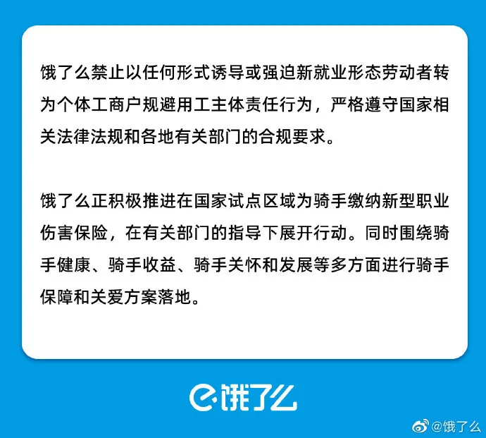 餓了麼聲明稱,餓了麼禁止以任何形式誘導或強迫新就業形態勞動者轉為個體工商户規避用工主體責任行為,嚴格遵守國家相關法律法規和各地有關部門的合規要求。