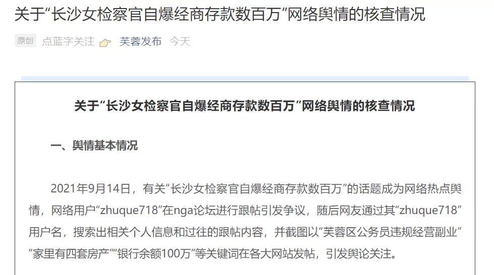 8. 官方通報“長沙女檢察官自爆經商存款數百萬”:言論系吹噓 嚴肅批評