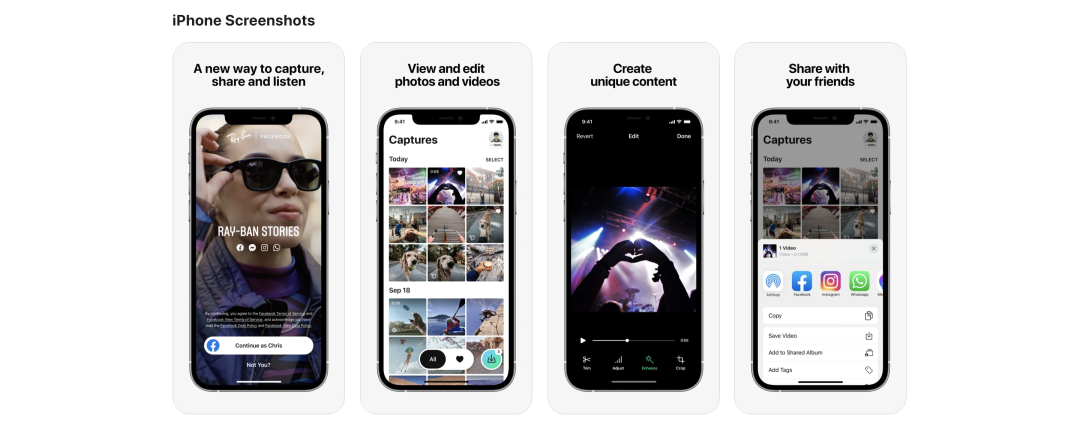 拍攝可以説是這款眼鏡的「殺手級功能」。用户可以説「Hey Facebook,拍張照片」等語音指令,讓眼鏡自動捕捉用户眼前的景色,或者手動按鏡腿上的實體按鈕拍照或錄製視頻。眼鏡的存儲空間有限,為此 Facebook 開發了一個叫 Facebook View 的 app,用户可以將拍攝內容無縫傳輸到手機進一步加工,然後發到 Facebook 家族應用和 TikTok 等社交媒體上。