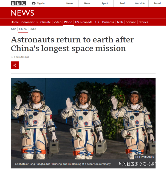 英國廣播公司(BBC)寫道:“這次任務成功完成,再次證明了中國在太空領域日益增長的信心和能力。”