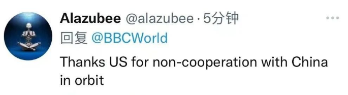 在BBC的留言板下,外國網友諷刺這一切要“感謝美國在太空不與中國合作之恩。”
