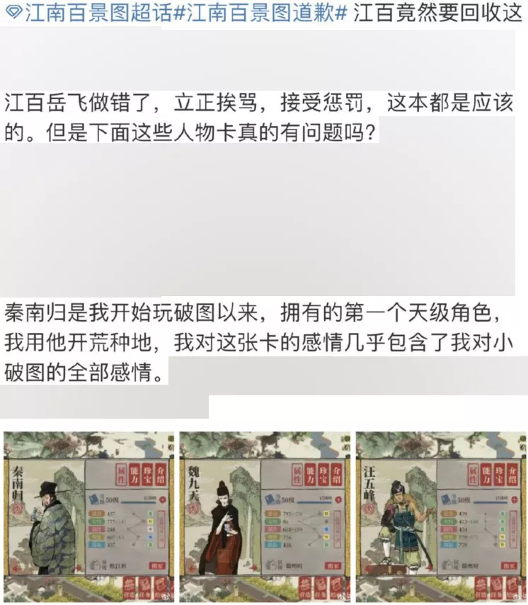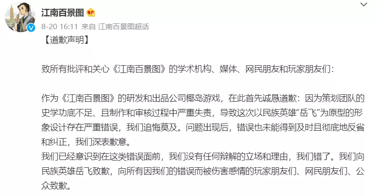 被點名後,江南百景圖第一時間撤下了相關問題的素材,並公開道歉,在道歉中江南百景圖的製作方還決定完全刪除「岳飛」等多名遊戲角色。