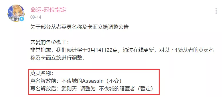 但是當玩家仔細一瞧,看到了關於「英靈名稱」調整的細則,才意識到那張他們抽卡時最想看到的「金色殺階」卡背,可能變成了「不夜城的Assassin」的「立繪」。
