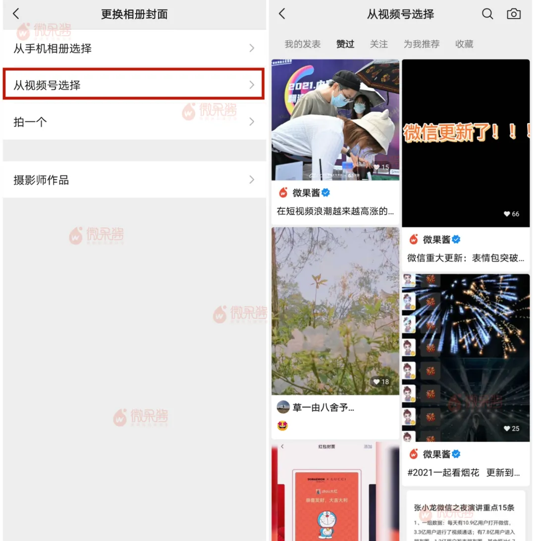 在更換朋友圈封面的選項中,新增“從視頻號選擇”選項,點擊即可從用户已發表、點贊、關注等視頻號中選擇想要的視頻,將其設置為朋友圈封面。