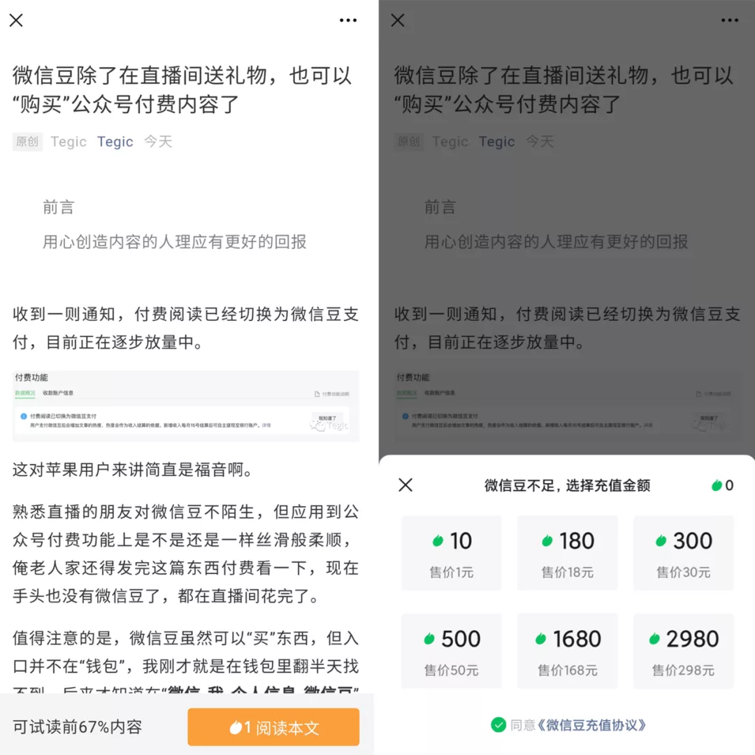 一年之後,隨着視頻時代的到來,公眾號付費閲讀與視頻直播打賞進行了互通。2021年9月6日,部分公眾號收到“付費閲讀已經切換為微信豆支付”的通知,不過目前該功能還在逐步放量中。