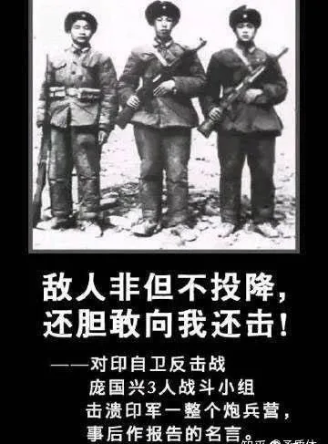 龐國興、冉福林、王世軍等3人,為追殲潰軍而與部隊失聯,臨時組隊,深入印軍防區15公里,擊潰1個炮兵營,攻佔2個炮兵陣地,繳獲7門火炮。他們當時講了一句話,傳為美談: