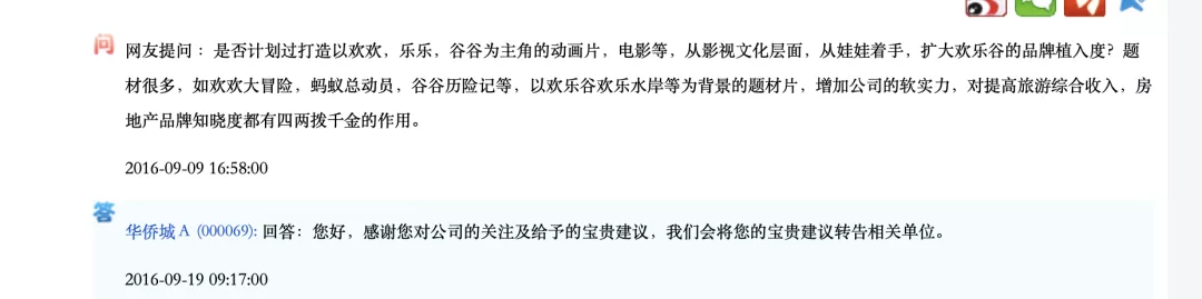 但歡樂谷孵化的IP顯然沒有能力承擔起這樣的重任,有股民在互動平台上向華僑城提問,是否有計劃過打造以歡歡、樂樂、谷谷為原型的影視作品,以提高品牌的知名度。