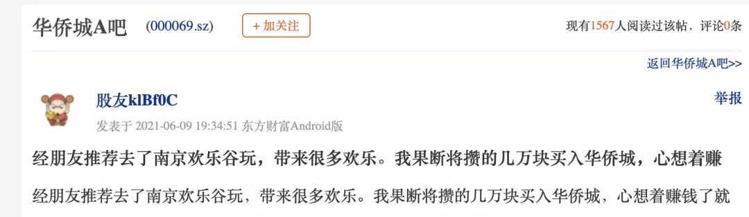 股民興致勃勃地將華僑城A加入購物車,覺得將來股票一定大漲。“誰家生了孩子會不去歡樂谷玩呢?”