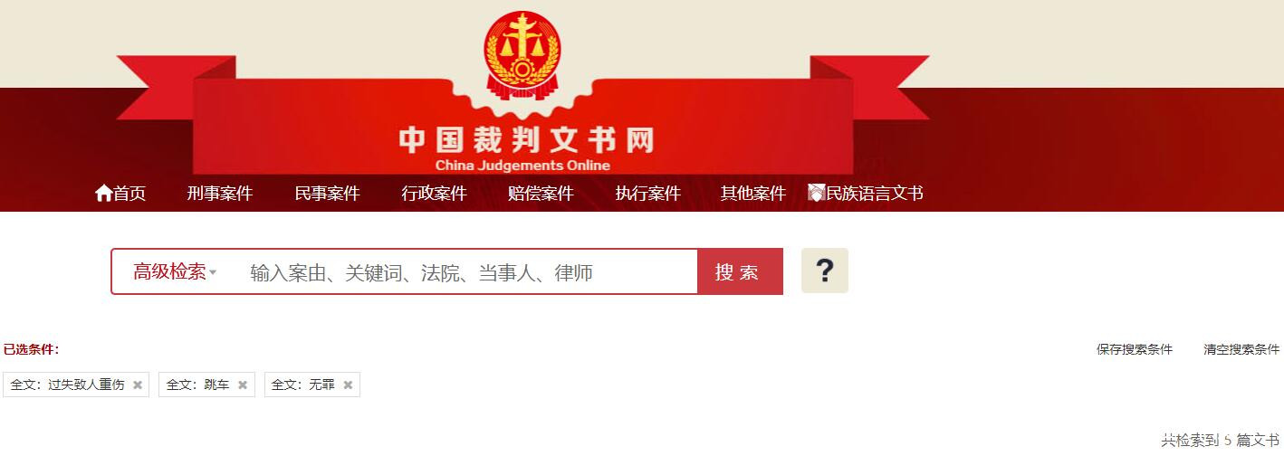 接着以“過失致人重傷,跳車,無罪”為關鍵詞檢索可搜到5篇文書: