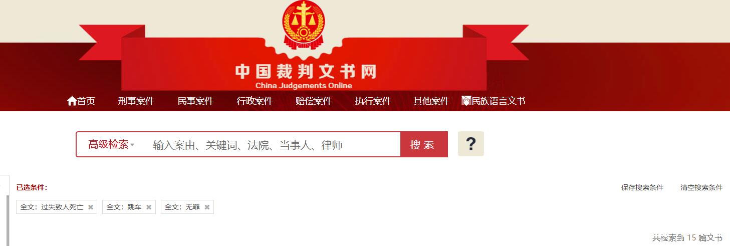 在中國裁判文書網上以“過失致人死亡,跳車,無罪”為關鍵詞進行檢索可搜到15篇文書: