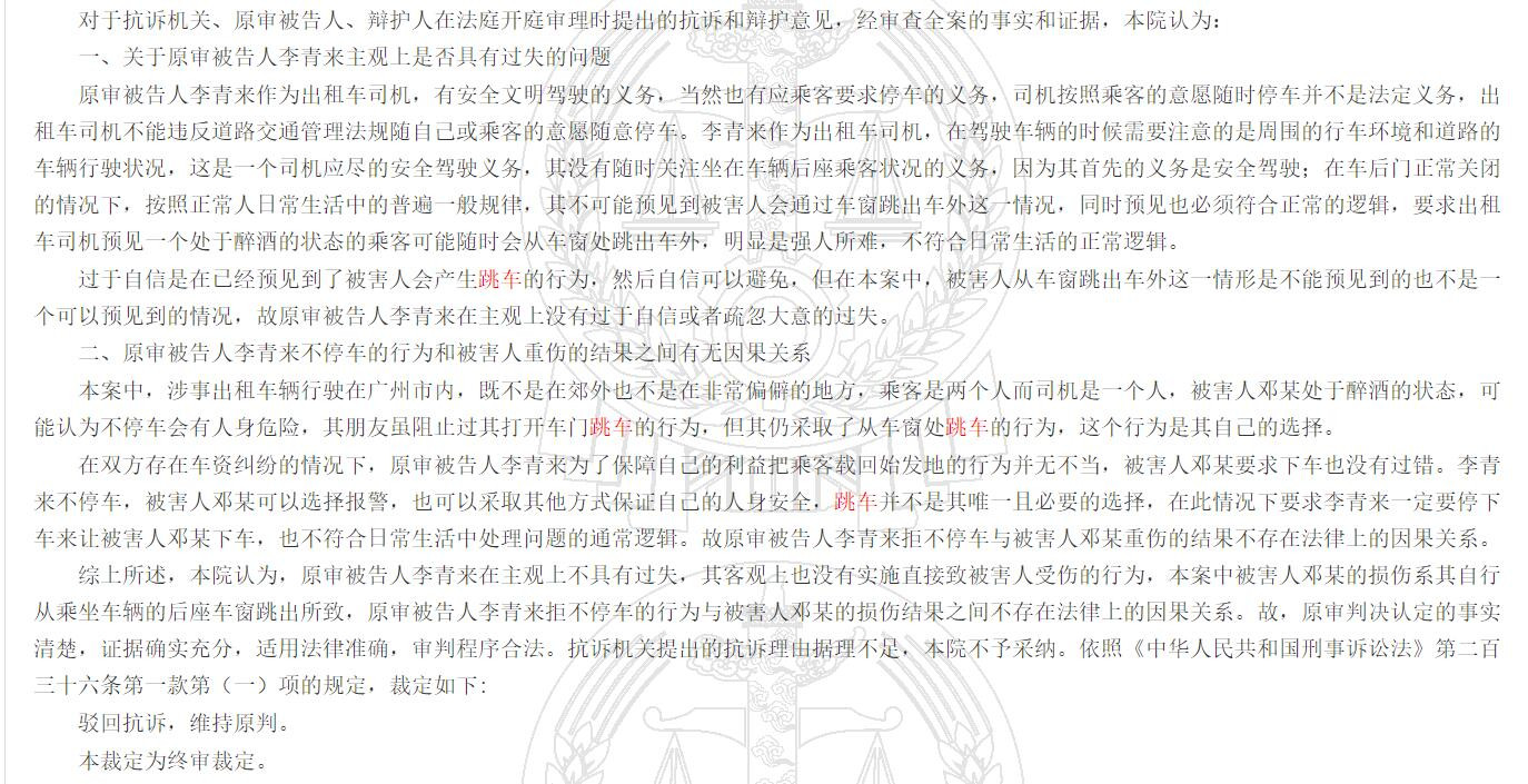 這15個案子挨個看下來,凡是法院最終認定被告人(司機)犯有過失致人死亡罪的判決書中都有一句“應當預見被害人可能跳車,由於疏忽大意而未能預見”,同時還列舉了相應證據,如果被害人威脅司機要跳車或打開車門嚇唬司機等,同時司機沒有在第一時間採取行動的。凡是法院最終認定被告人(司機)無罪的,都是檢方無法舉證證明被害人有明確告知司機要跳車。