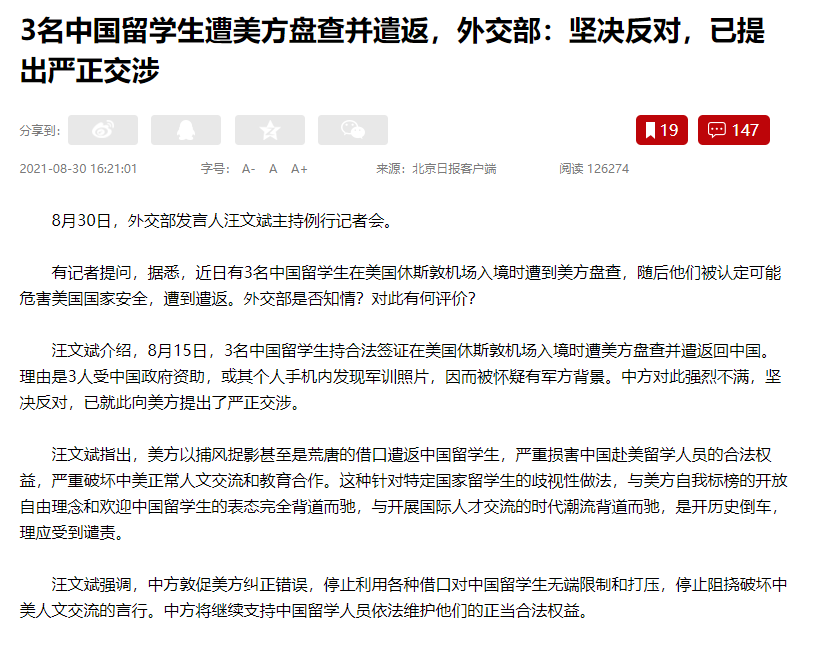 7月25號,我外交部副部長謝鋒,與美國常務副國務卿舍曼在天津會談。期間,中方向美方提出兩份清單。一份是要求美方糾正其錯誤對華政策和言行的清單,一份是中方關切的重點個案清單。在這兩份清單中,中方都提到了中國赴美留學生簽證遭到限制、在美受到無端打壓的問題,要求美方切實尊重、保護中國公民和機構在美的合法權益。