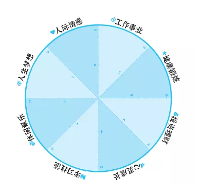 通過為自己生命中最重要的幾個方面(比如工作、財富、夢想、家庭生活、親子關係、健康等,你覺得重要的方面)的滿意度打分,分析人生髮展的不同面向。(分值範圍:0~10分,10分為最滿意,0分為極不滿意。)