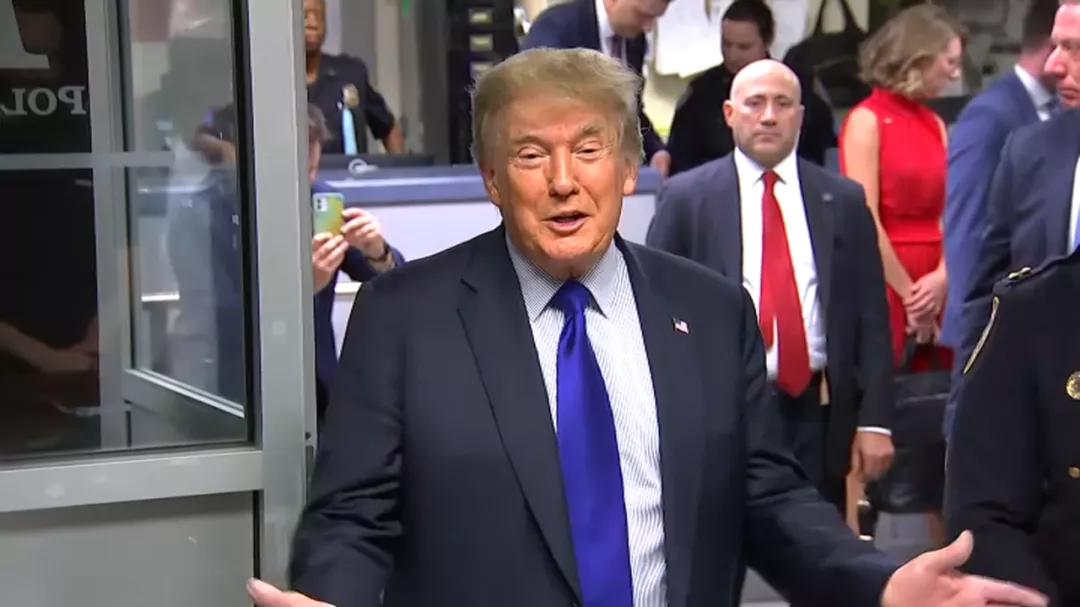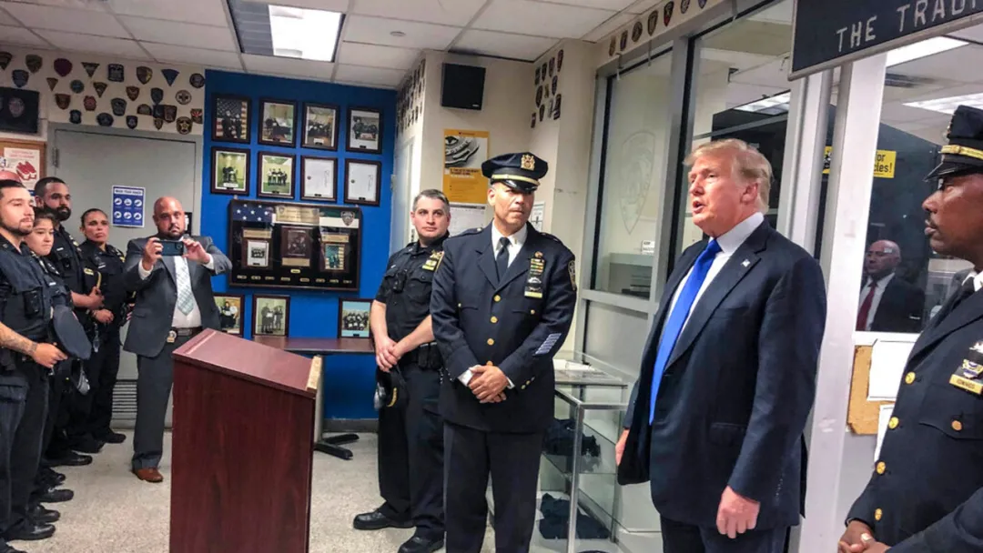 下午1點40分左右,特朗普離開了紐約警局,有人高聲叫道:“謝謝你保護了我們的安全。”