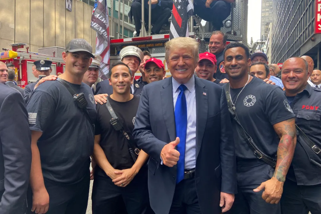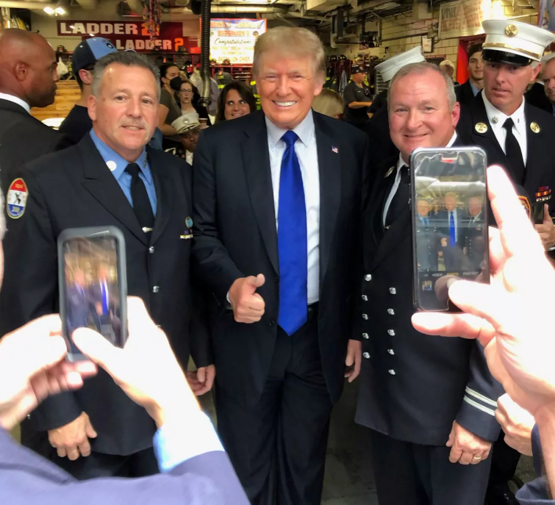 911事件20週年,特朗普訪問紐約市警察局和曼哈頓消防站,向救援人員致敬。