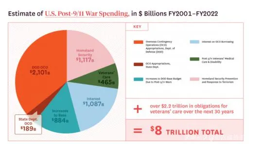 911之後的20年間,美國軍事開支超過8萬億美元,另外還有海外行動的各種花費贊助2.1萬億美元,國土安全和戰爭借款利息也超過了1萬億美元,林林總總算下來,美帝的9****11三大徵,花掉了14萬億美元。