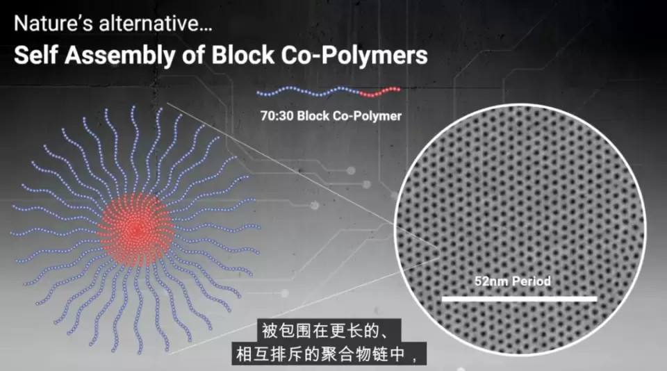 “自組裝材料的關鍵在於嵌段共聚物(BCP)。這些材料由兩條長度只有幾十納米的聚合物鏈組成,它們具有特殊的熱力學特性,這兩條聚合物鏈彼此厭惡、相互排斥,就像水油一樣不相容,但如果我們強制使他們結合在一起,他們便可形成具有高度規律性的納米結構。”Skjonnemand解釋説,“一塊巨型的材料可能共有數十億個這樣的聚合物鏈。其中,相似的聚合物會試圖粘合在一起,同時,相反的部件則試圖彼此分離。因此,聚合物鏈會四處移動,直到形成一個固定形狀。