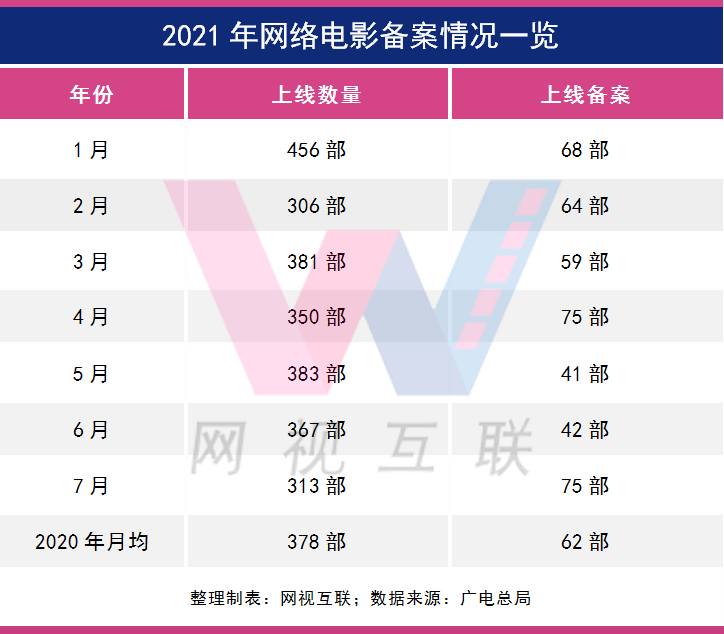 截至7月底(目前僅公佈至7月底),網絡電影規劃備案過審共2556部,月均過審365部,上線備案共424部,月均過審61部,各項指標雖略低於2020年,但其實項目儲備已經足夠。