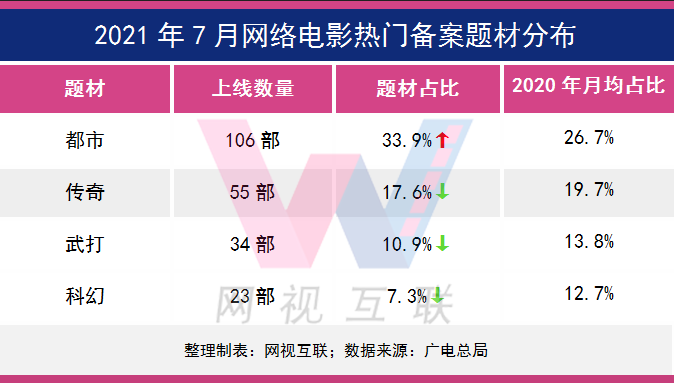 雖然都市題材向來都是備案大户,但在過去幾個月,都市題材佔比曾一度下降到20%左右,而7月份,都市題材佔比接近34%,不僅高於過去幾個月,甚至比2020年月均佔比都高出7個百分點。