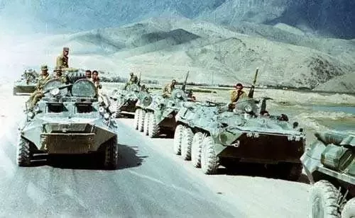 在阿富汗山間谷地行進的蘇軍裝甲車隊