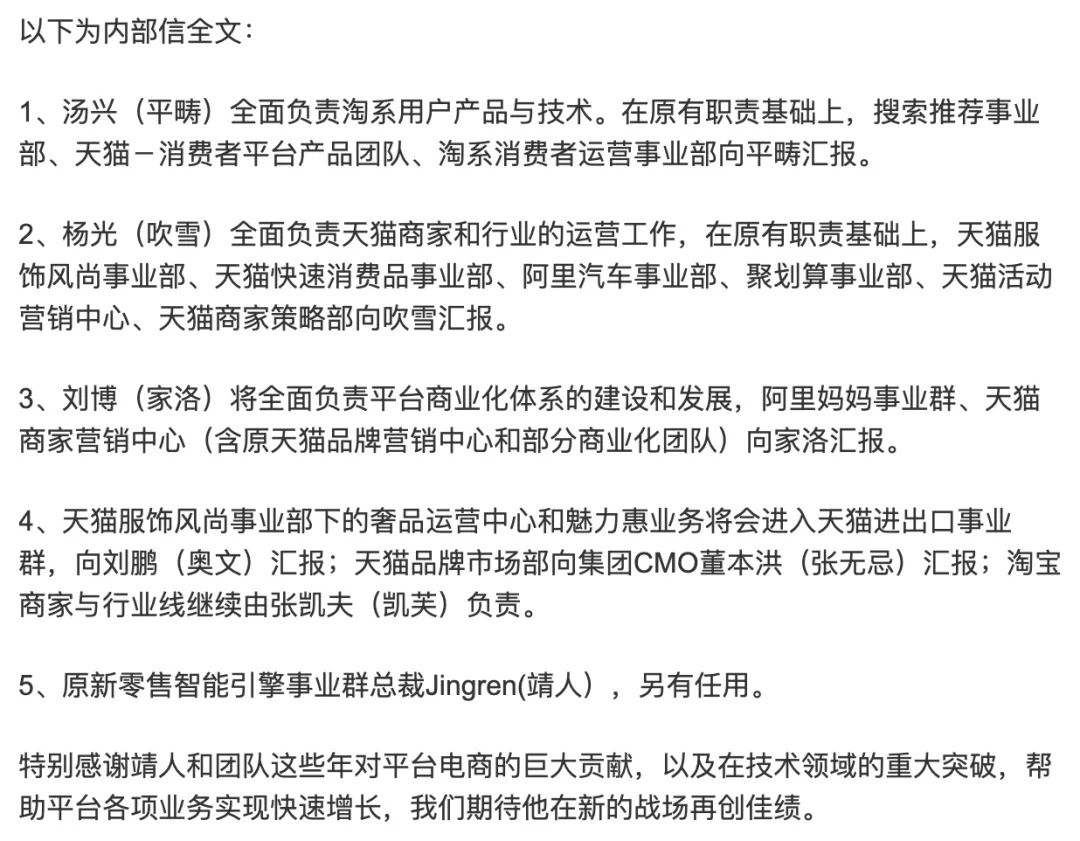 有好事者發現,2019年12月成為淘寶、天貓、阿里媽媽三大事業羣總裁的蔣凡,在這次公開郵件的落框僅僅是“淘寶天貓總裁”。