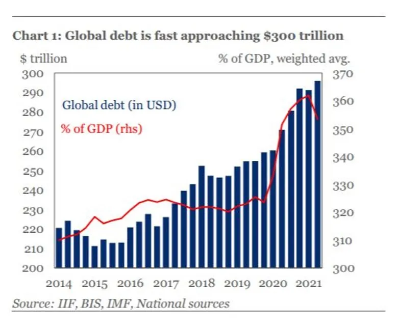 考慮一下這個案例中的數字。根據IIF的計算,在2021年第二季度末,全球債務總額達到了創紀錄的296萬億美元,比一年前的270.9萬億美元有所增加。