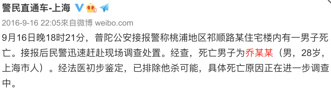 2016年9月16日晚上22時05分,上海警方發佈了一條喬任梁離世的警情通報。