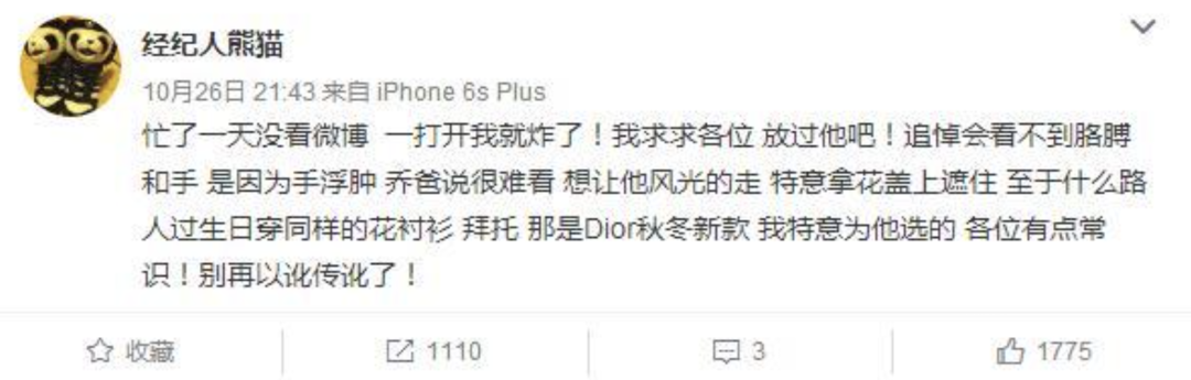 但因為疑似沒有胳膊,又引發了一輪死因猜想。逼得經紀人發微博回應,請求謠言放過喬任梁。