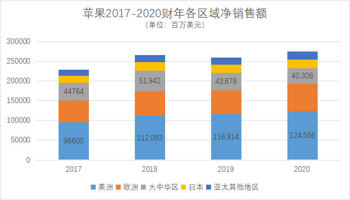 從近四個財年的年報來看,蘋果的財務狀況也還是保持良好態勢,淨銷售額(Net Sales)方面,除了2019年略有下滑,基本保持了逐年增長的趨勢,尤其在美洲地區穩步攀升。而分品類計算的淨銷售額也不乏亮點,可穿戴、家用設備及配件和服務的增長較為明顯,其中,2020財年,蘋果的可穿戴、家用設備及配件淨銷售額已經佔到當年總收入的11.1%,服務收入已經佔到當年總收入的19.6%。這些,都可以看作蘋果股價逐年增長的有力理由。