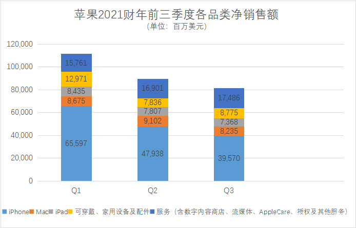 然而,從2021財年的前三個季度財報來看,蘋果的狀況似乎卻不太理想,Q1淨銷售額為 1,114 億美元,季度每股攤薄收益為1.68美元;Q2淨銷售額為896億美元,季度每股攤薄收益為1.40 美元;Q3淨銷售額為814億美元,季度每股攤薄收益為1.30 美元。雖説比2020財年同期相比均有較大幅增長,但總體説來處於逐季度下滑的局面。唯一實現增長的還是來自於服務方面的收入。