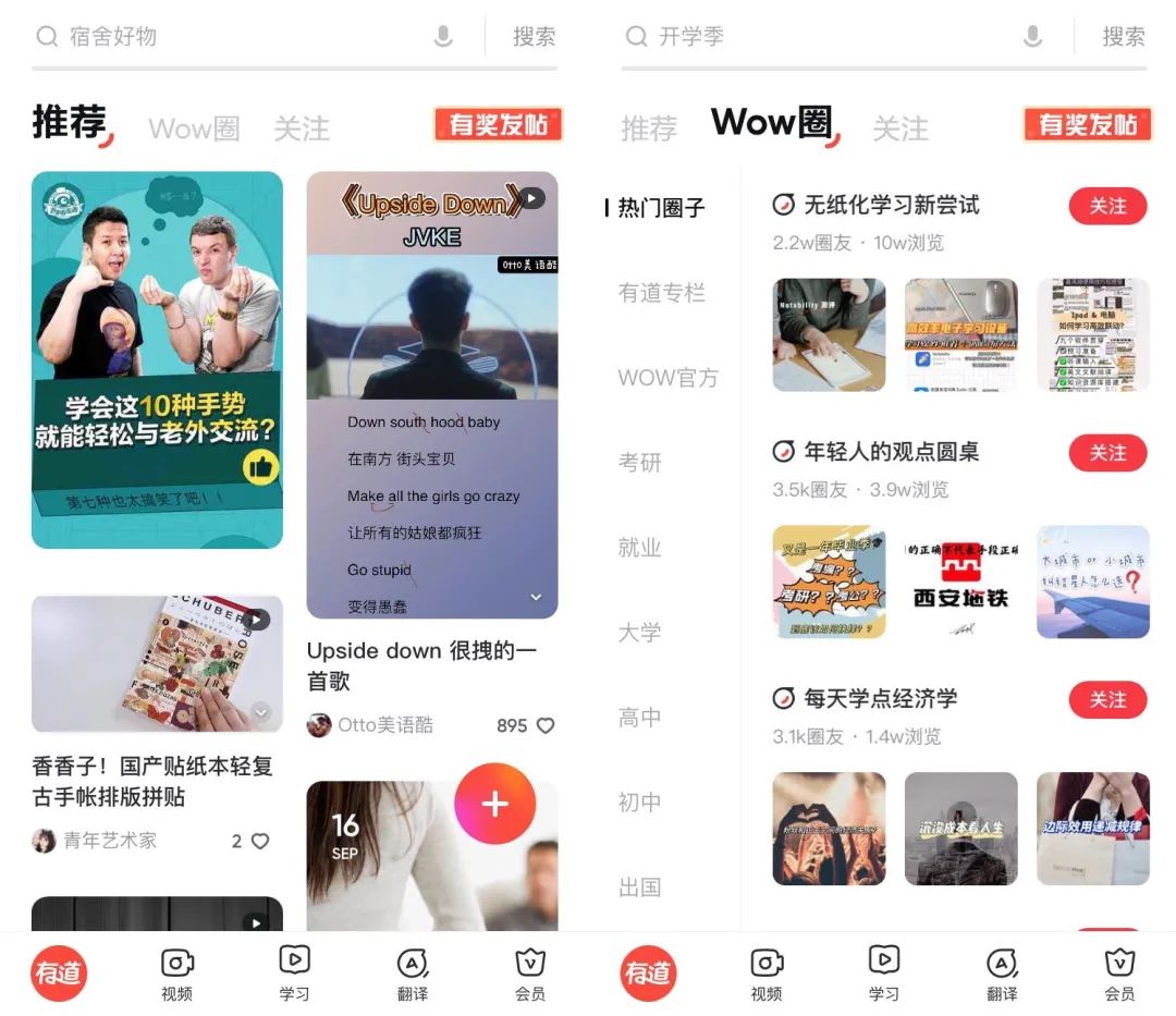 根據AI藍媒匯的觀察,打開有道詞典的首頁,除了頂部突出的搜索框分區,中部數十個功能標籤入口,接下來最主要的就是類似小紅書一樣的圖文、視頻的瀑布流排列,名為Wow圈。