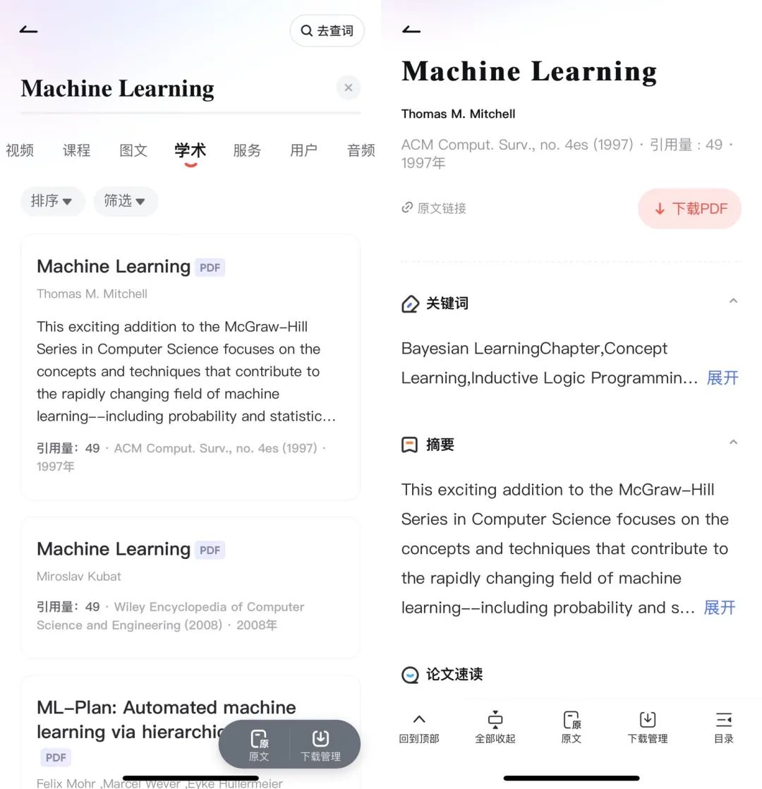 況且,升級之後的有道詞典能“查”的已經不限於“單詞”了。根據有道方面介紹,本次升級平台接入了知名大數據服務平台AMiner服務,能夠為用户提供論文速讀功能。“平台已具備3億文章量,其中10%內容支持查看全文,且無需跳轉。”極大地方便了專業領域用户的更深層次需求。