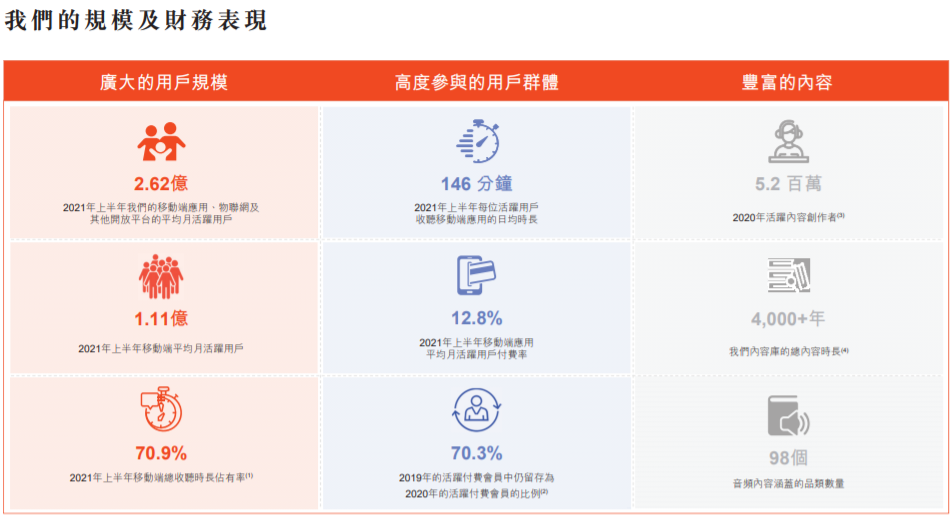 一方面,根據招股書數據,截至2021年6月,喜馬拉雅平均總月活躍用户達到2.6億。其中,移動端平均月活躍用户為1.1億,另外1.5億則是通過物聯網及其他開放平台收聽音頻內容的平均月活躍用户。