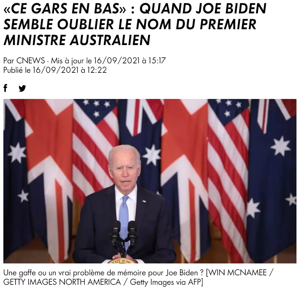 ▲ 據法媒報道,在美英澳線上會議時,拜登突然忘記了澳大利亞總理的名字,只能以“那個傢伙”來代替。(Cnews新聞報道截圖)