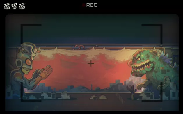 主人公即將進場,左上角的場記板是這一關裏玩家的血量,一旦耗盡導演就會喊“CUT!”