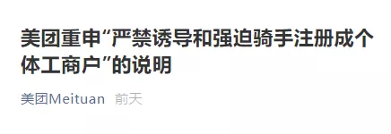 包括美團、餓了麼在內的平台們,在最近也都已經發公告表示:嚴禁誘導強迫騎手註冊個體工商户。