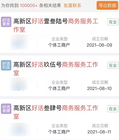 其他地區用類似 " 數字編號 + XXX 工作室、服務部 ” 為名的個體工商户,也在某靈活用工 App 上也以每天 1 萬以上的規模增加。