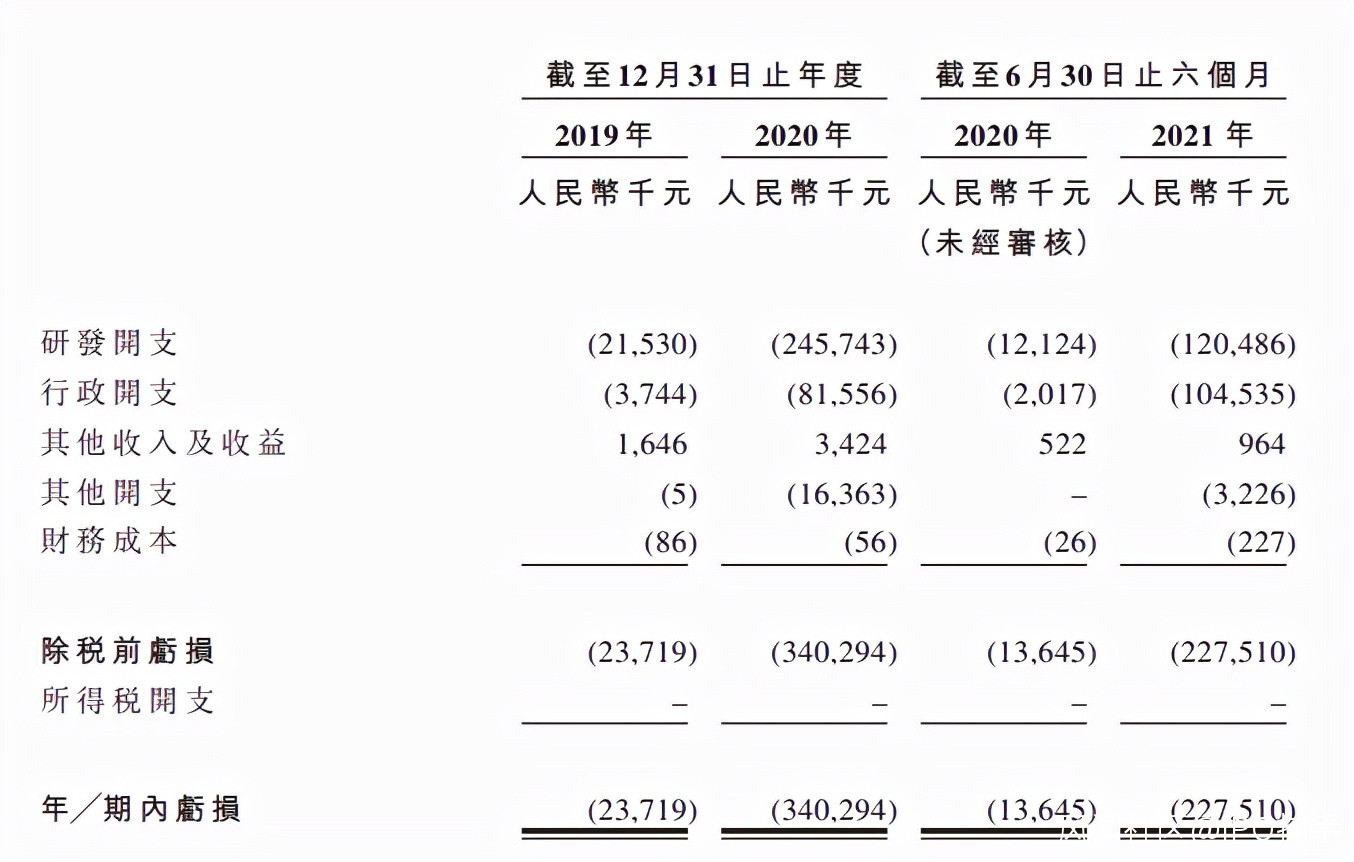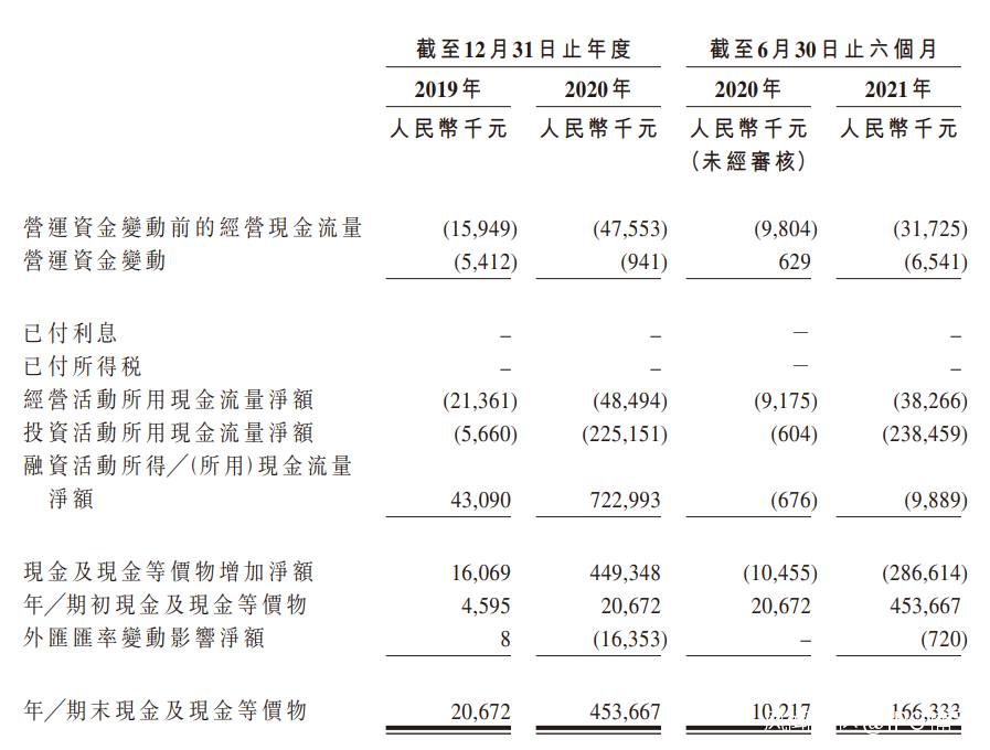 而在2018年度、2019年度以及2021年上半年的虧損數據中,公司產生經營性現金淨流出分別為2140萬元、4850萬元和3830萬元,該經營性現金淨流出主要是由於公司於往期記錄期間產生大額研發成本。
