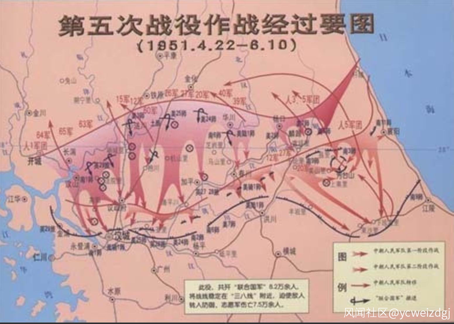 1951.4.22,第5次戰役打響。乙方發動第2次春季攻勢,逼進鐵原、漣川。志願軍傷亡7.5萬人,乙方傷亡8萬人。志願軍63軍全線撤退40公里。