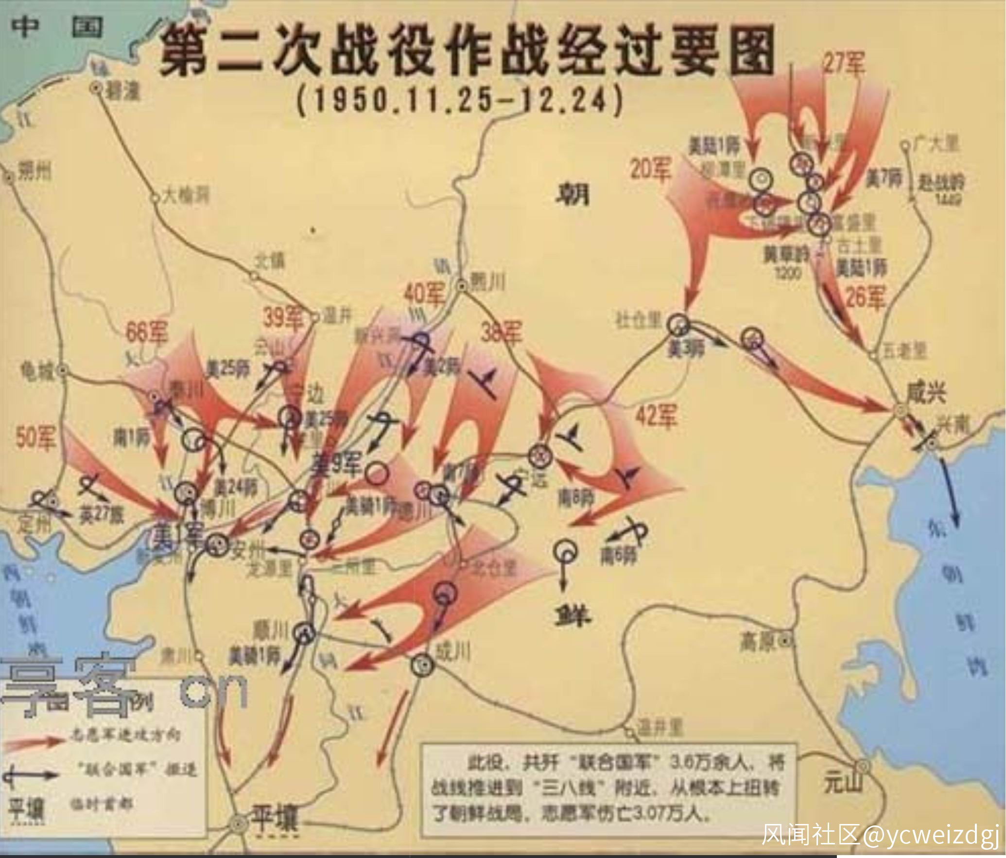 1950.11.27,甲方志願軍第9兵團在長津湖突襲美第7集團軍團戰鬥隊(3千人)和美海軍陸戰隊第1師幷包圍,但在空軍和X兵團掩護下突圍循海路撤退。1950.11.30,乙方美軍第8集團軍被甲方志願軍第13兵團擊退至西北。1950.12.6,甲方中、朝軍收復平壤,乙方被擊退至三八線,扭轉了朝鮮戰局。
