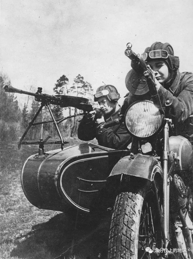 駕駛着TIZ AM-600摩托車的蘇聯紅軍士兵,挎鬥上架設着DP-27輕型機槍,1941年7月。