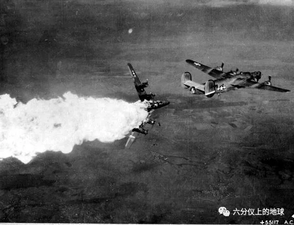 1944年,德國上空,一架B-24H被高炮炮彈擊中凌空燃燒。